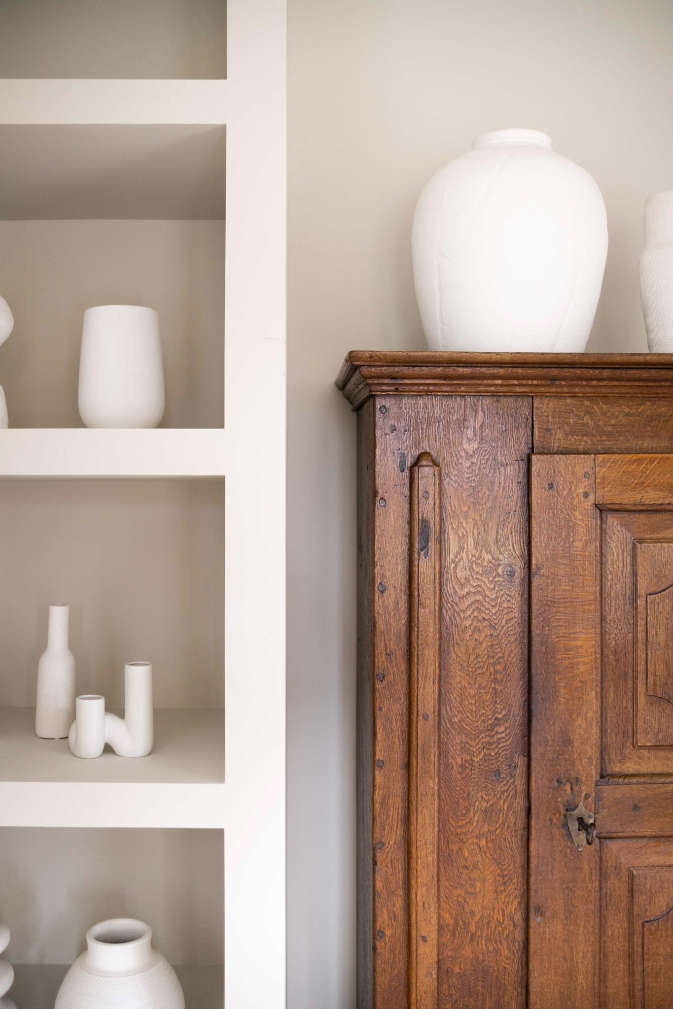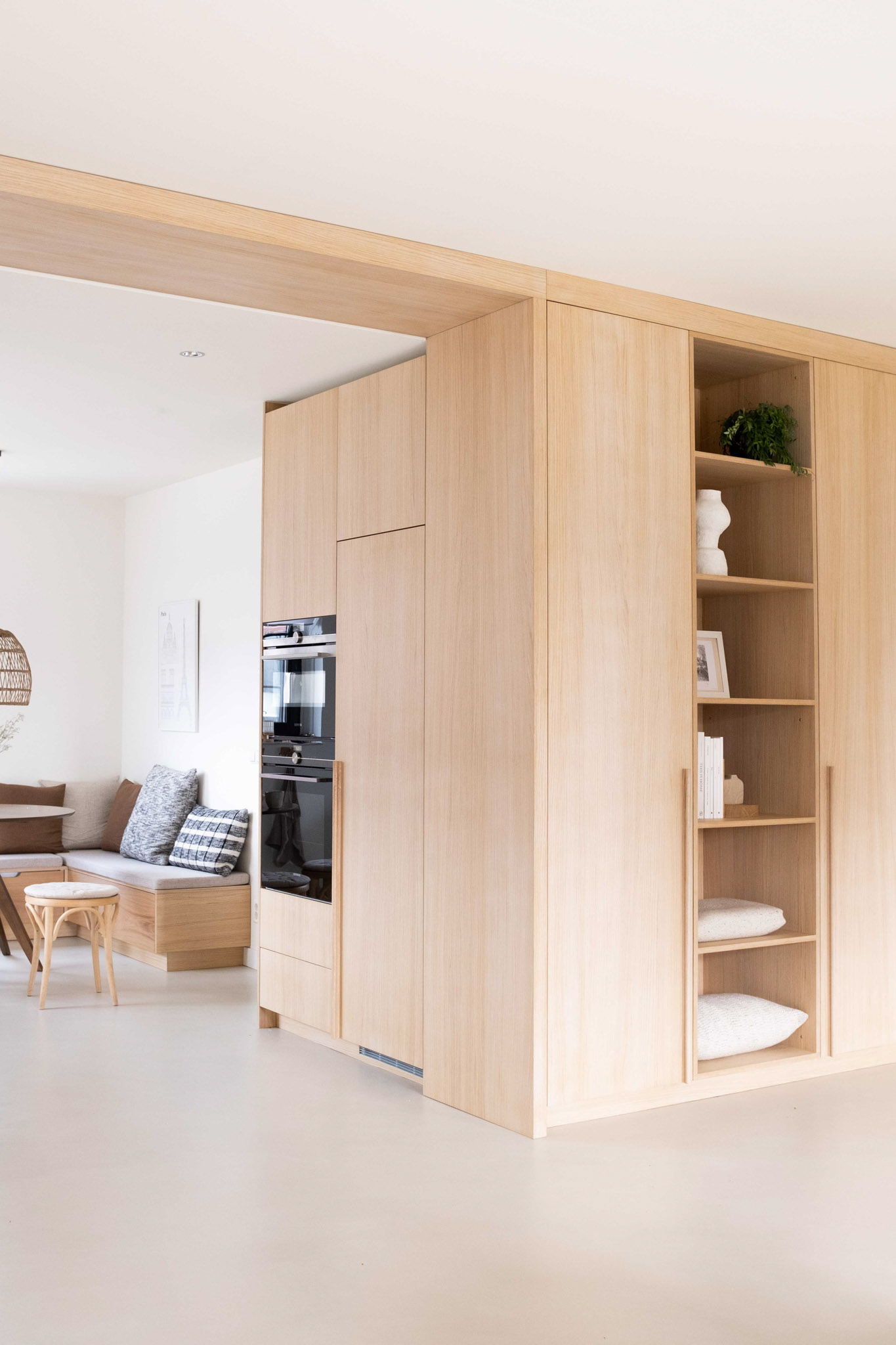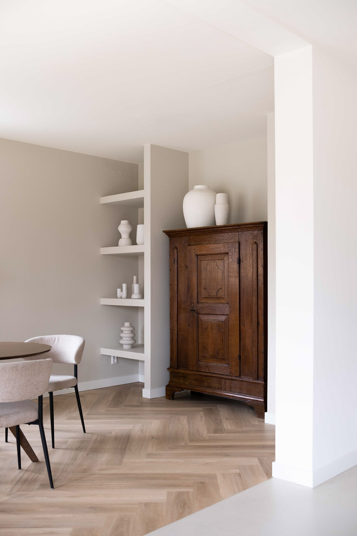 Door twee eettafels te plaatsen – één in de keuken en één in de eetkamer – wordt er gezorgd voor zowel flexibiliteit als gezelligheid. Het materiaalgebruik is zorgvuldig in balans gebracht. Strakke, moderne elementen zoals een gietvloer en stalen deuren worden subtiel gecombineerd met warme, natuurlijke materialen, waaronder eikenhout in de ensuite. Een antieke kast heeft een prominente plek in het interieur gekregen. Door de kast te integreren in een minimalistische maatkast, komt het antieke meubel prachtig tot zijn recht, terwijl het toch in harmonie blijft met het moderne ontwerp.