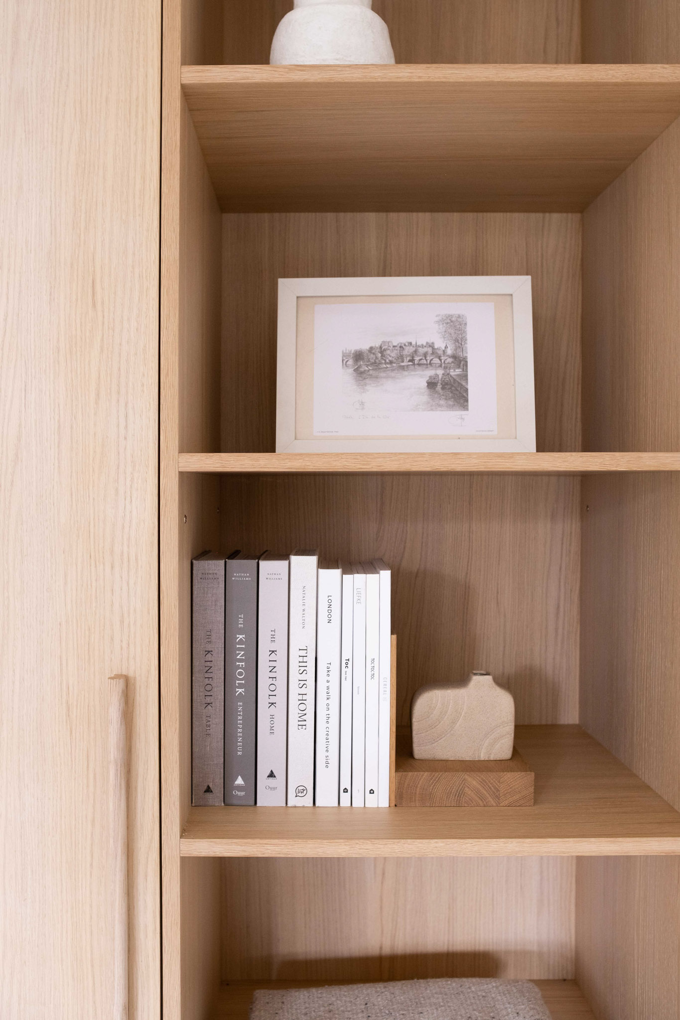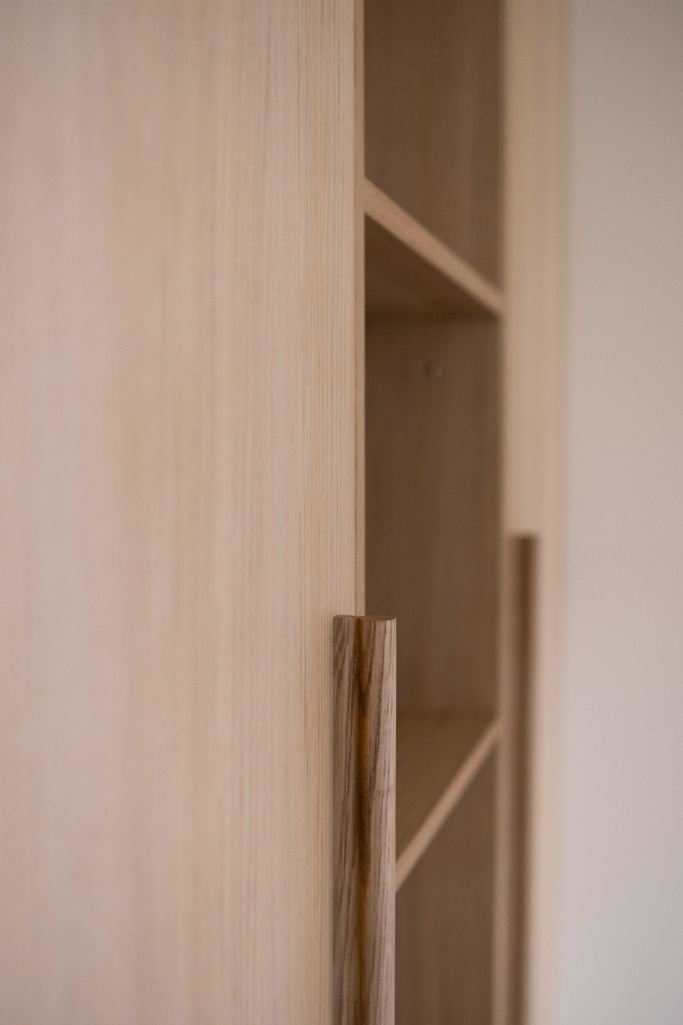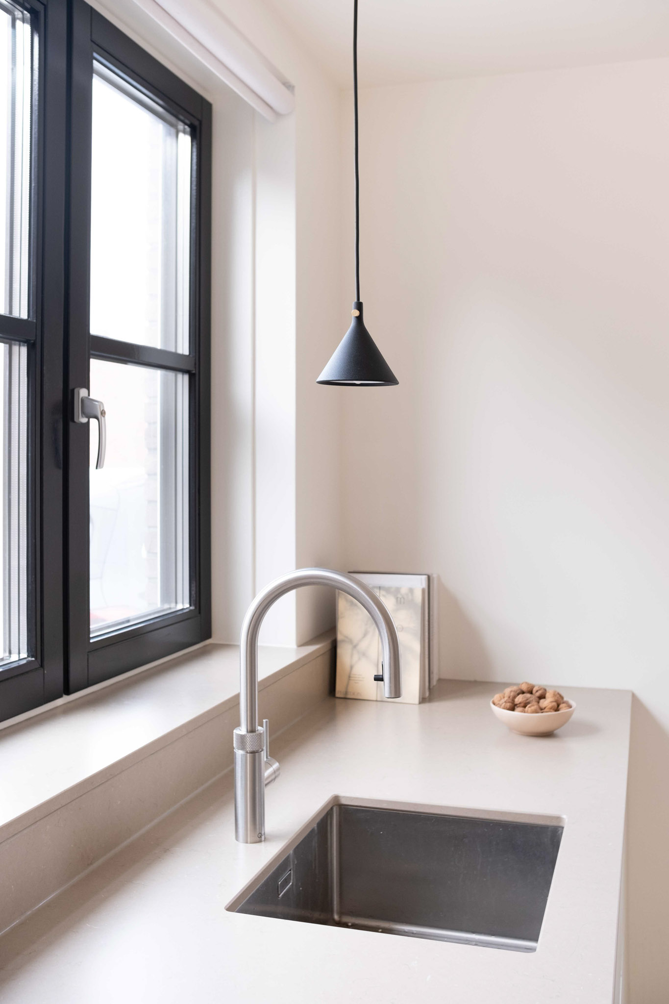 Door twee eettafels te plaatsen – één in de keuken en één in de eetkamer – wordt er gezorgd voor zowel flexibiliteit als gezelligheid. Het materiaalgebruik is zorgvuldig in balans gebracht. Strakke, moderne elementen zoals een gietvloer en stalen deuren worden subtiel gecombineerd met warme, natuurlijke materialen, waaronder eikenhout in de ensuite. Een antieke kast heeft een prominente plek in het interieur gekregen. Door de kast te integreren in een minimalistische maatkast, komt het antieke meubel prachtig tot zijn recht, terwijl het toch in harmonie blijft met het moderne ontwerp.