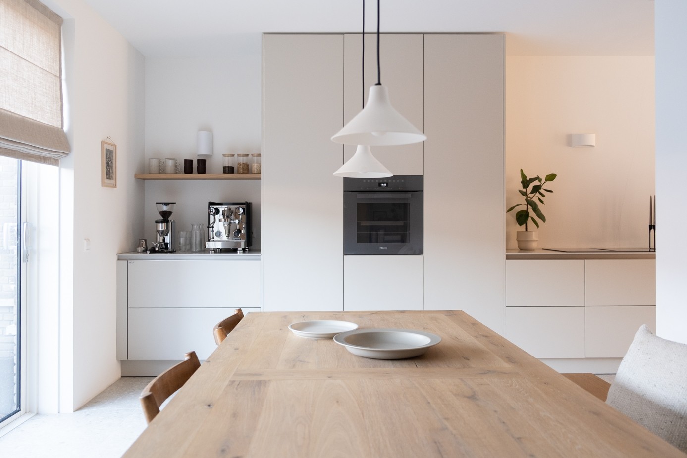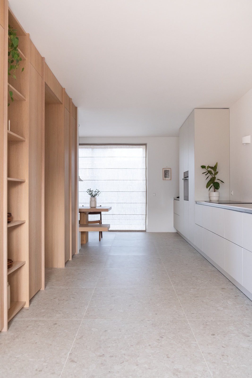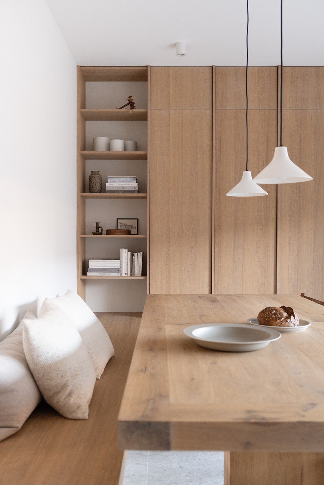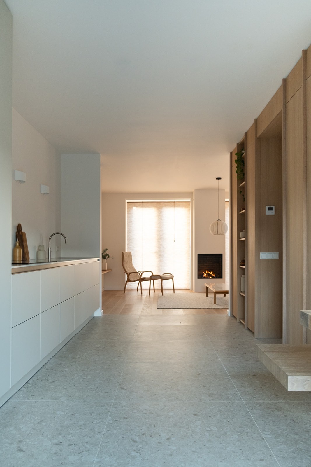Omdat de woning nog in ontwikkeling was, vroeg het ontwerpproces om vooruitdenken en vertrouwen. Belangrijke keuzes werden vroeg gemaakt, met oog voor de leefstijl van het gezin en de toekomst. Maatwerk in eikenhout, afgewerkt met een naturel hardwax, biedt veel bergruimte zonder de rust te verstoren. Grote tegels lopen over in een houten vloer in de woonkamer, waardoor elke zone een eigen karakter krijgt. Natuurlijke materialen zoals wol, linnen en jute versterken het tijdloze gevoel. Het resultaat is een licht, warm interieur dat zorgvuldig is opgebouwd en voelt alsof het huis speciaal voor dit gezin is ontworpen.