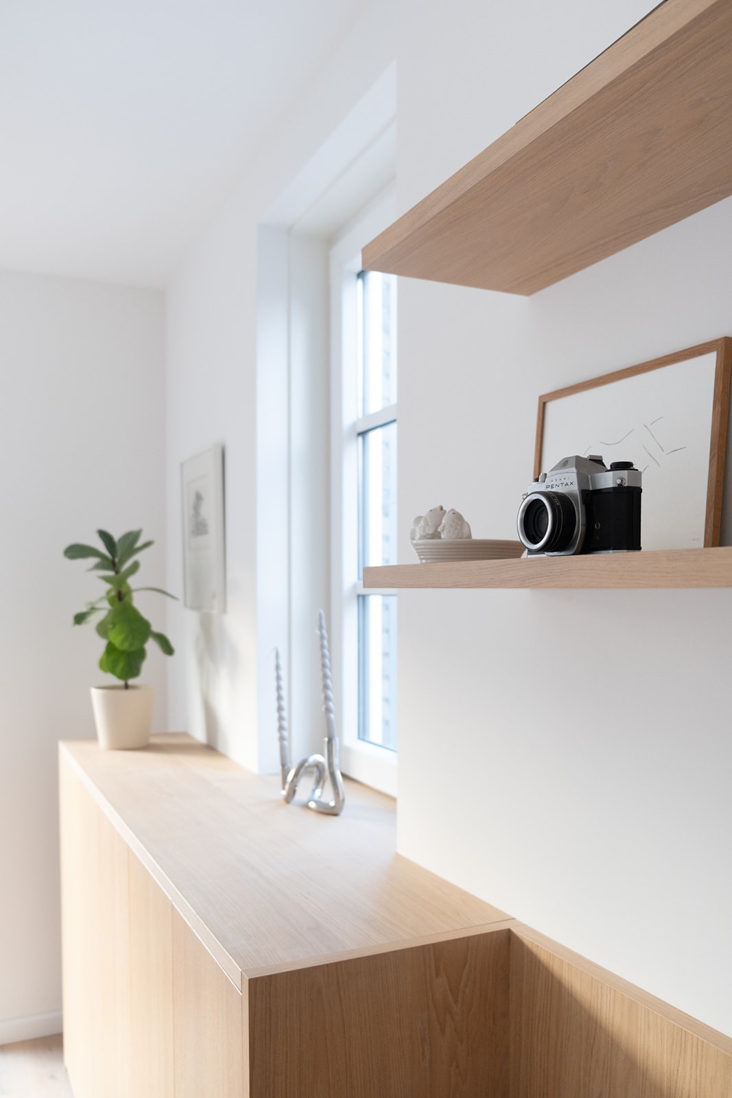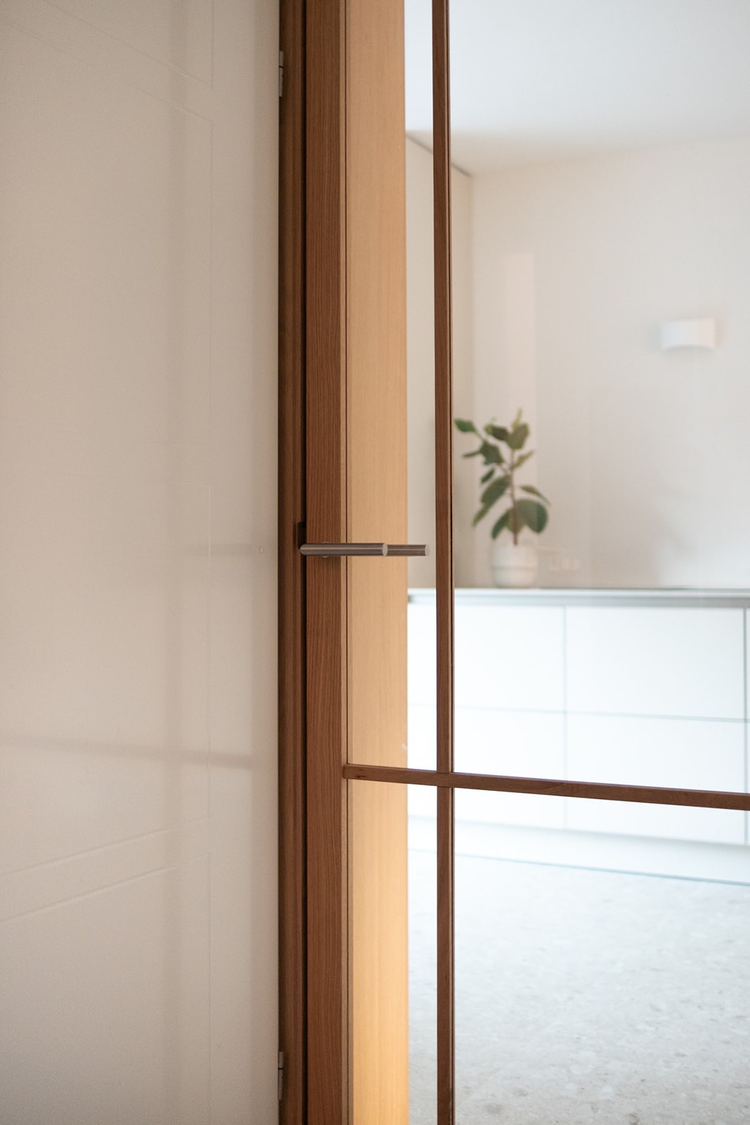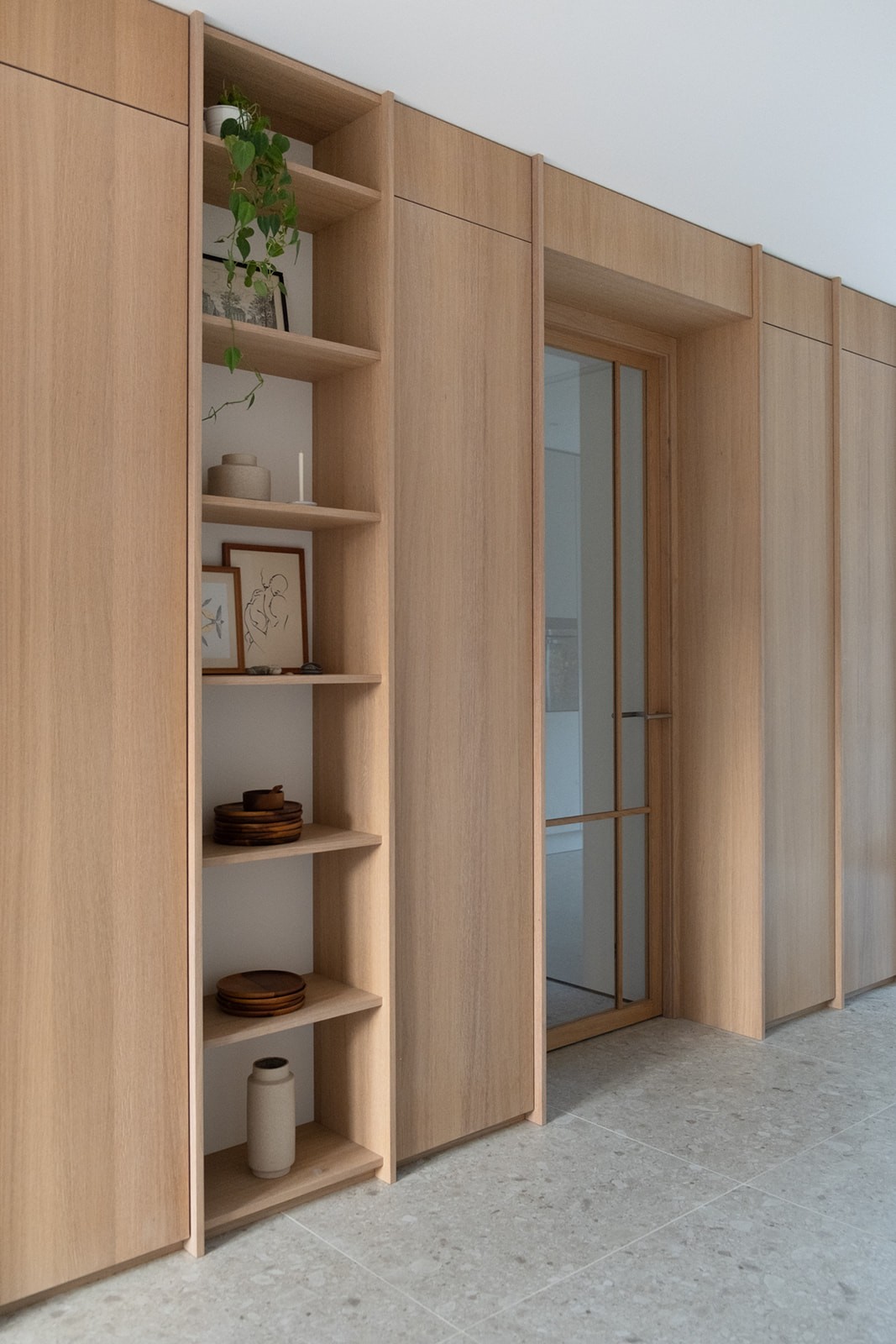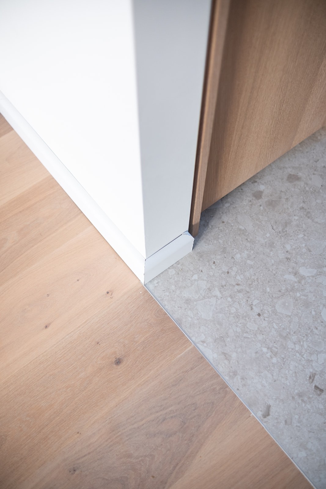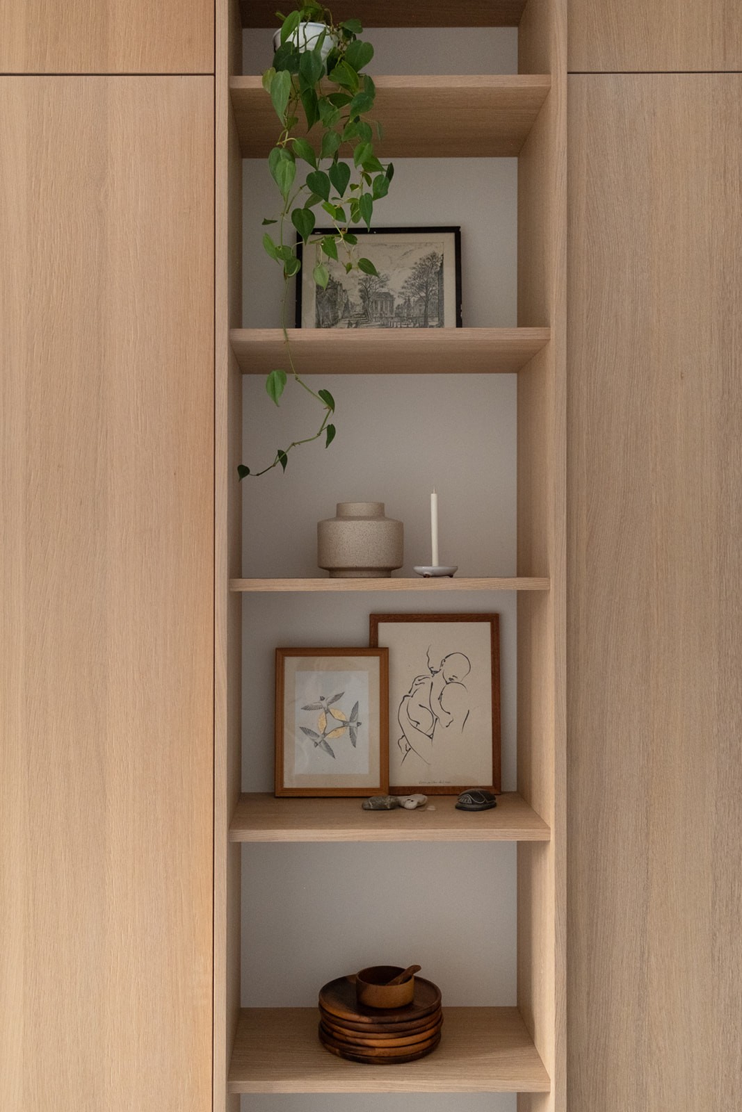 Omdat de woning nog in ontwikkeling was, vroeg het ontwerpproces om vooruitdenken en vertrouwen. Belangrijke keuzes werden vroeg gemaakt, met oog voor de leefstijl van het gezin en de toekomst. Maatwerk in eikenhout, afgewerkt met een naturel hardwax, biedt veel bergruimte zonder de rust te verstoren. Grote tegels lopen over in een houten vloer in de woonkamer, waardoor elke zone een eigen karakter krijgt. Natuurlijke materialen zoals wol, linnen en jute versterken het tijdloze gevoel. Het resultaat is een licht, warm interieur dat zorgvuldig is opgebouwd en voelt alsof het huis speciaal voor dit gezin is ontworpen.