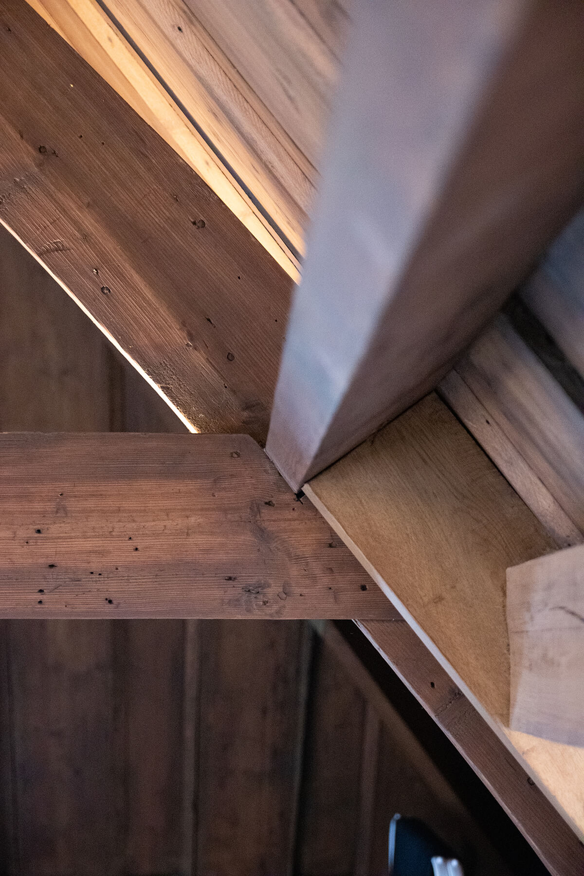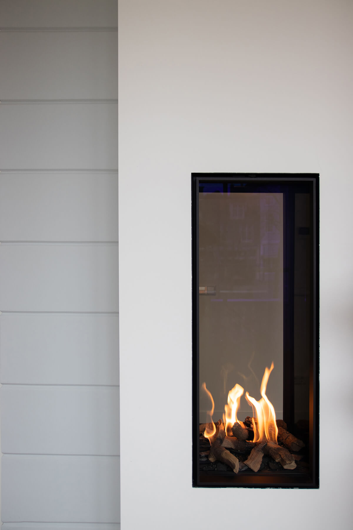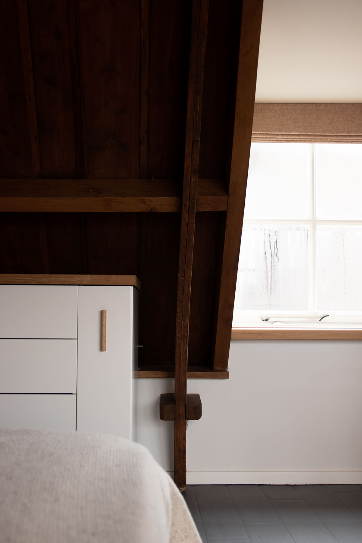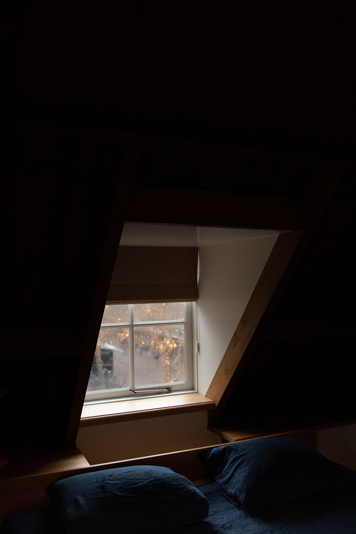 De open en ruime keuken biedt volop mogelijkheden voor eten en sociale interactie. Een opvallend element is de flexibele logeerkamer, waar het bed uit op maat gemaakte kasten tevoorschijn komt wanneer er gasten zijn; op andere momenten fungeert deze ruimte als extra zitkamer. De slaapkamer op de bovenste verdieping grenst aan het dakterras. Het prachtige schuine dak speelt de hoofdrol in deze kamer, waarbij het bed centraal in de ruimte is geplaatst en de ruimte onder de schuine wanden is benut met op maat gemaakte kasten die voldoen aan de behoefte aan opbergruimte.