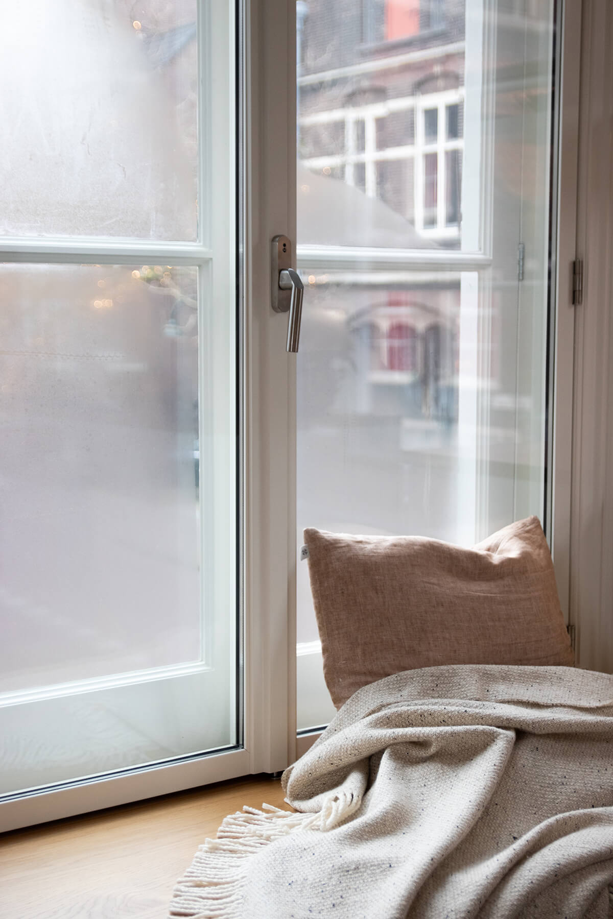 De opdrachtgever had een duidelijke visie voor het monumentale pand in het centrum van Delft: de begane grond bestemmen voor commerciële verhuur en de eerste en tweede verdieping, inclusief dakterras, inrichten als woonhuis. Design Studio Nu ontwierp een interieur waarbij alle functies op de woonverdieping met elkaar verbonden zijn, resulterend in een open en ruimtelijk gevoel dat toch gezelligheid behoudt. De woonkamer is gesitueerd in de historische serre met uitzicht op de Delftse Markt en de Nieuwe Kerk, waarbij het kleurenpalet is afgestemd op de tinten van de kerk.